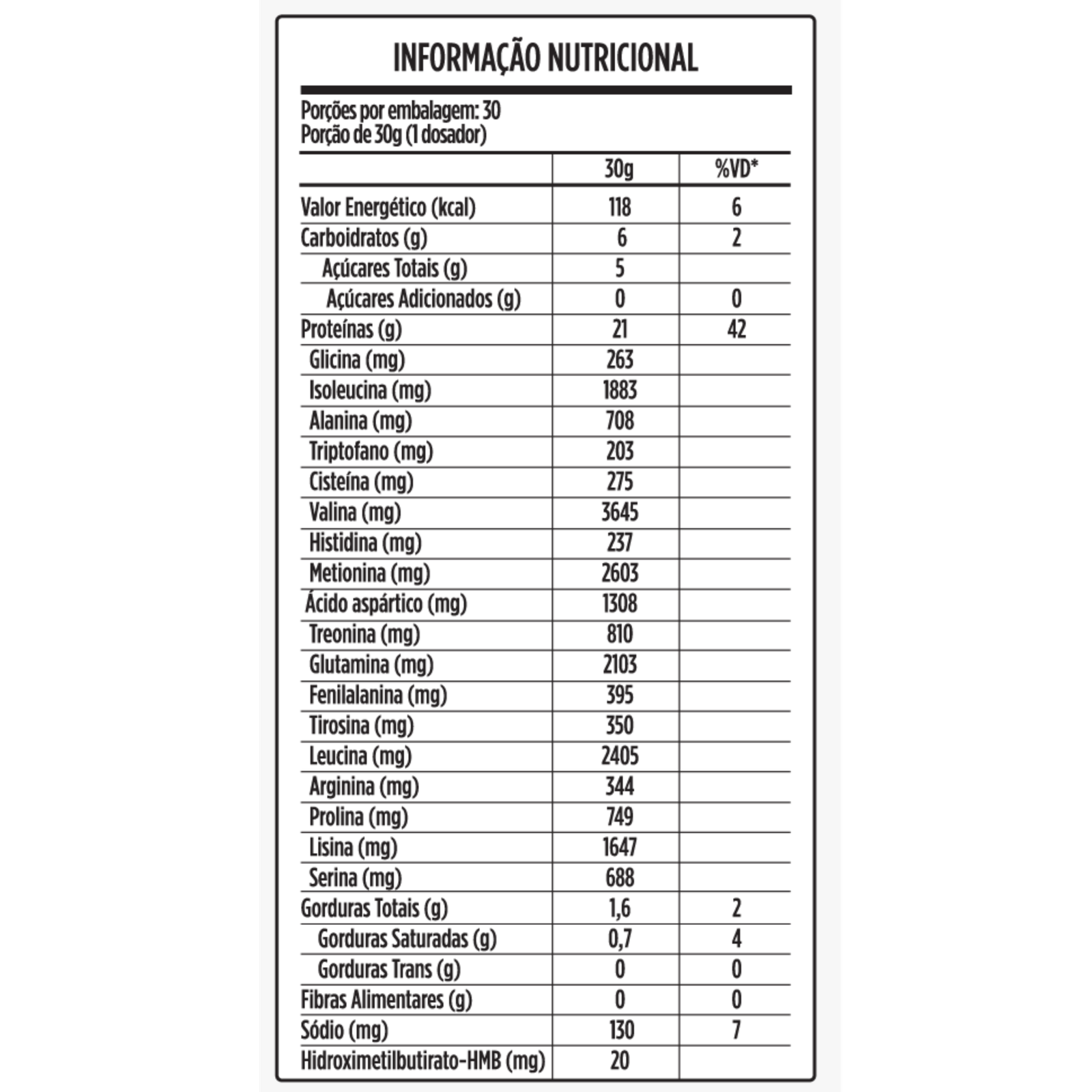 Whey 100% Concentrado: pote de 907g, rendimento aproximado 30 doses, com 21g de proteína, 7,8g de aminoácidos essenciais e 4,2g de BCAA por porção.